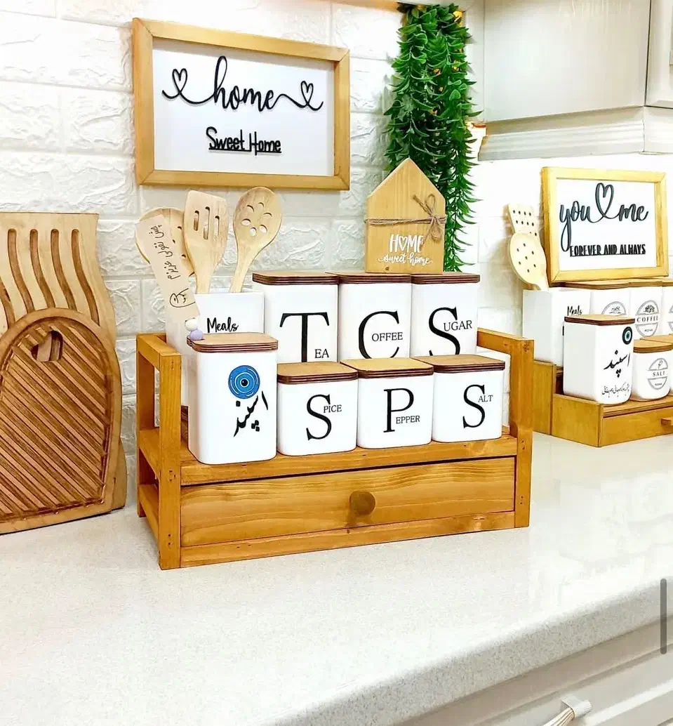 استند چوبی مناسب برای ادویه و ظروف و وسایل اشپزخانه نو هست کشو داره برای دستگیره و کفگیر ملاقه