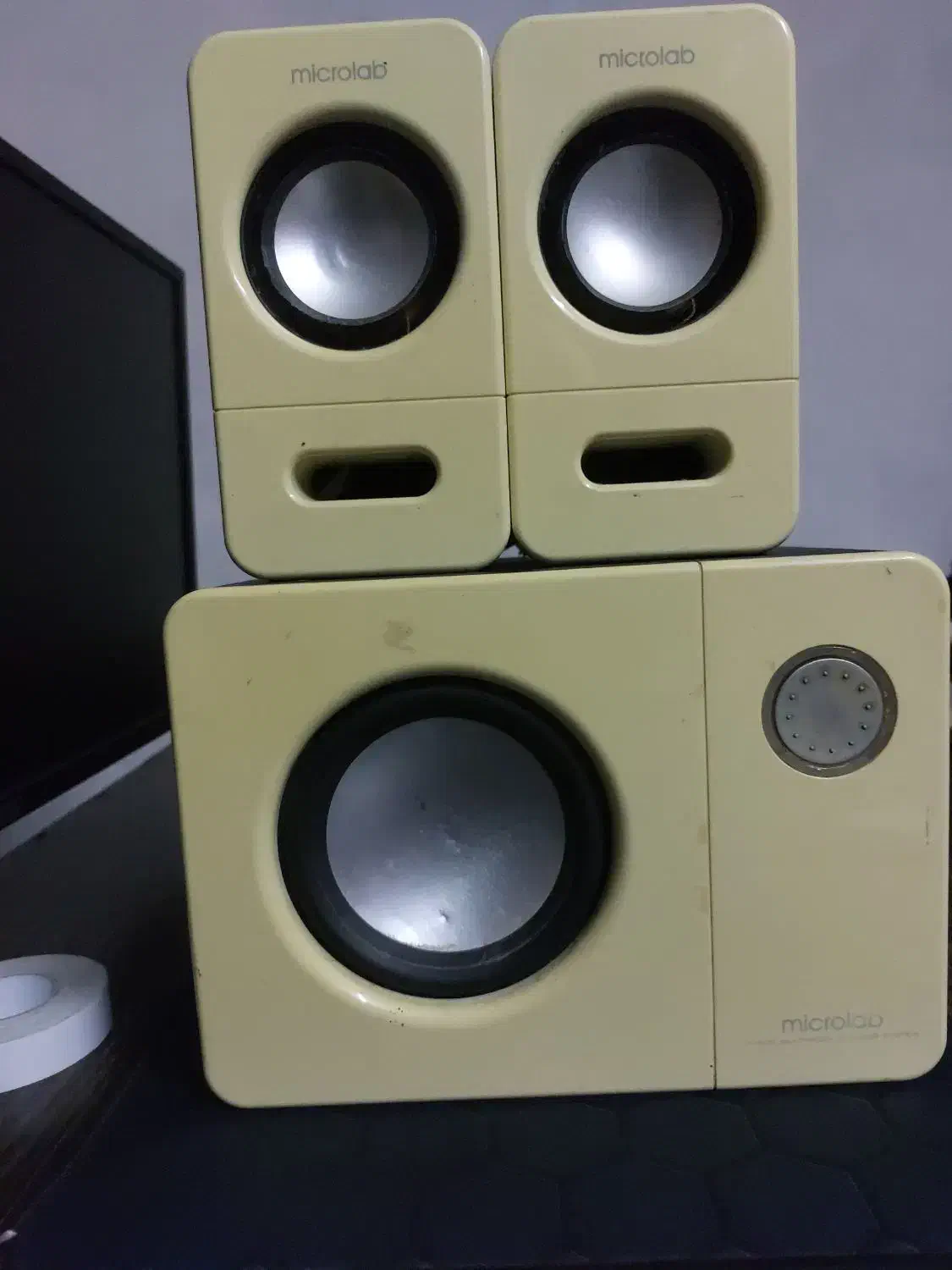 اسپیکر ۳تیکه base قابل تنظیم ولوم کنترل صدا فقط پلاستیک دورِ اسپیکرهای دو تا باند کوچیک چون یه مقدار پاره بود کلا بریدمش