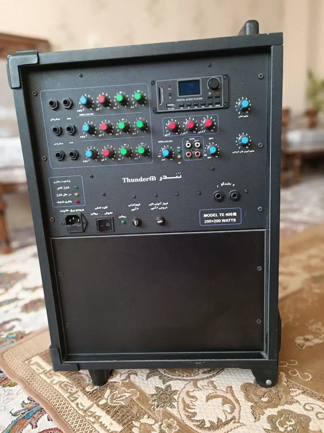 مشخصات : آمپلی فایر پرتابل تندر خانگی و بسیار کم کارکرد مناسب برای اجرای زنده و مجالس و میهمانی های خانگی 400 وات قدرت 2 کانال آمپلی فایر (هر یک به قدرت 200 وات) پهنای باند 40Hz - 15 KHz مجهز به یک میکروفن بی سیم ورودی و خروجی های ضبط به صورت جداگانه، جک RCA خروجی AUX برای اتصال به آمپلی فایر دیگر یا مانیتور صوتی با ولوم کنترل MP3 با قابلیت ضبط و پخش انواع فایل های صوتی 3 ورودی میکروفن بلوتوث رادیو FM و ریموت کنترل 1 کانال برای اتصال باند اضافه دارای باتری داخلی 24 ولت قابلیت شارژ ورودی هر لاین به صورت مجزا (ورودی آزاد و میکروفن) قیمت نو این دستگاه. ۲۷میلیون تومان است