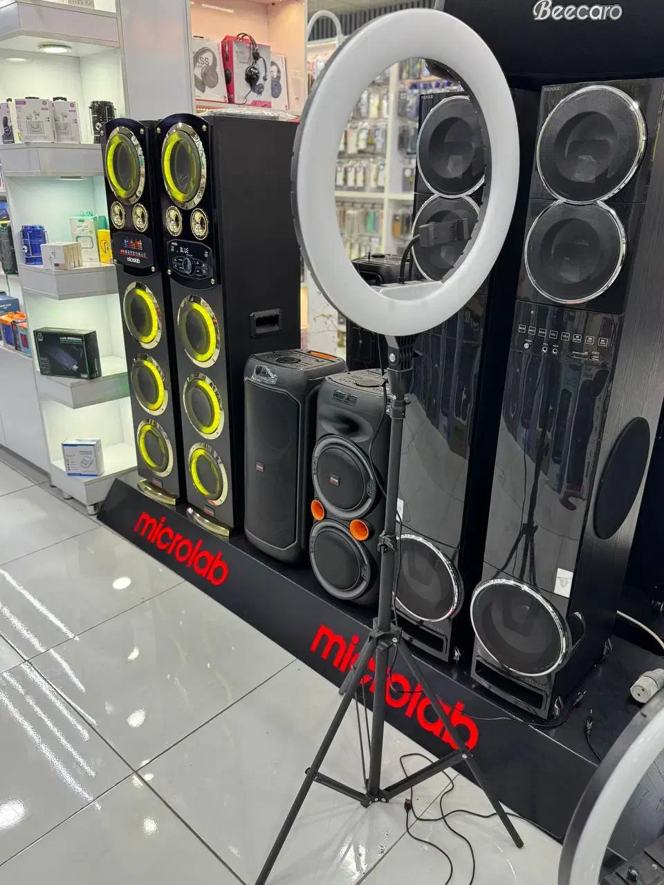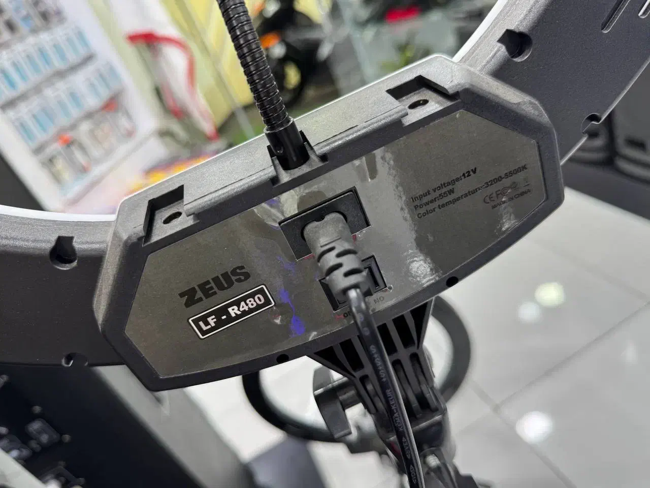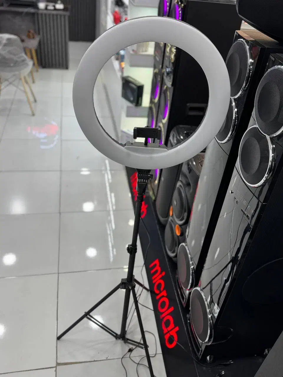 رینگ لایت ۱۸ اینچی مدل ZEUS همراه با سه پایه فقط یک بار استفاده شده سه تا گوشی نصب میشه رنگ آفتابی مهتابی هفت رنگ و ......