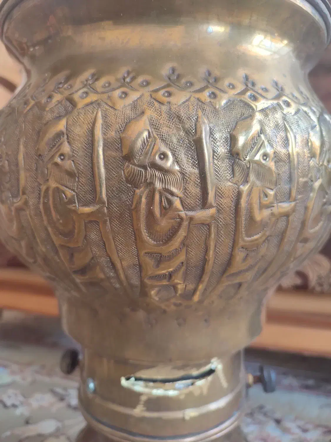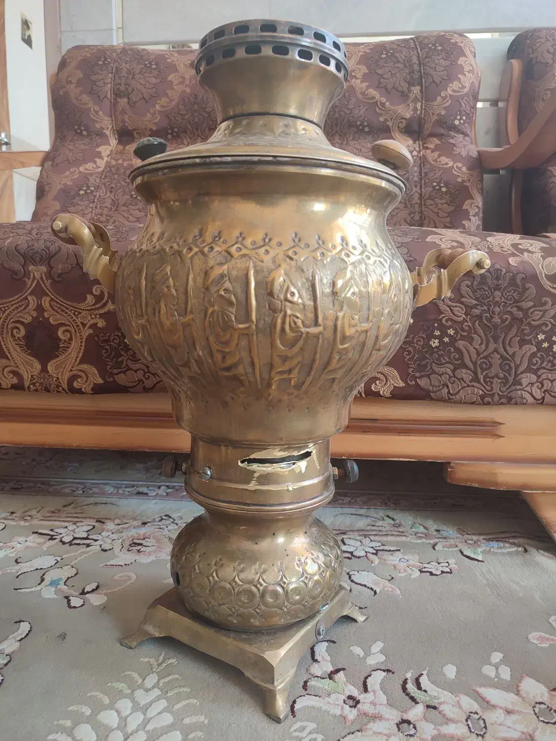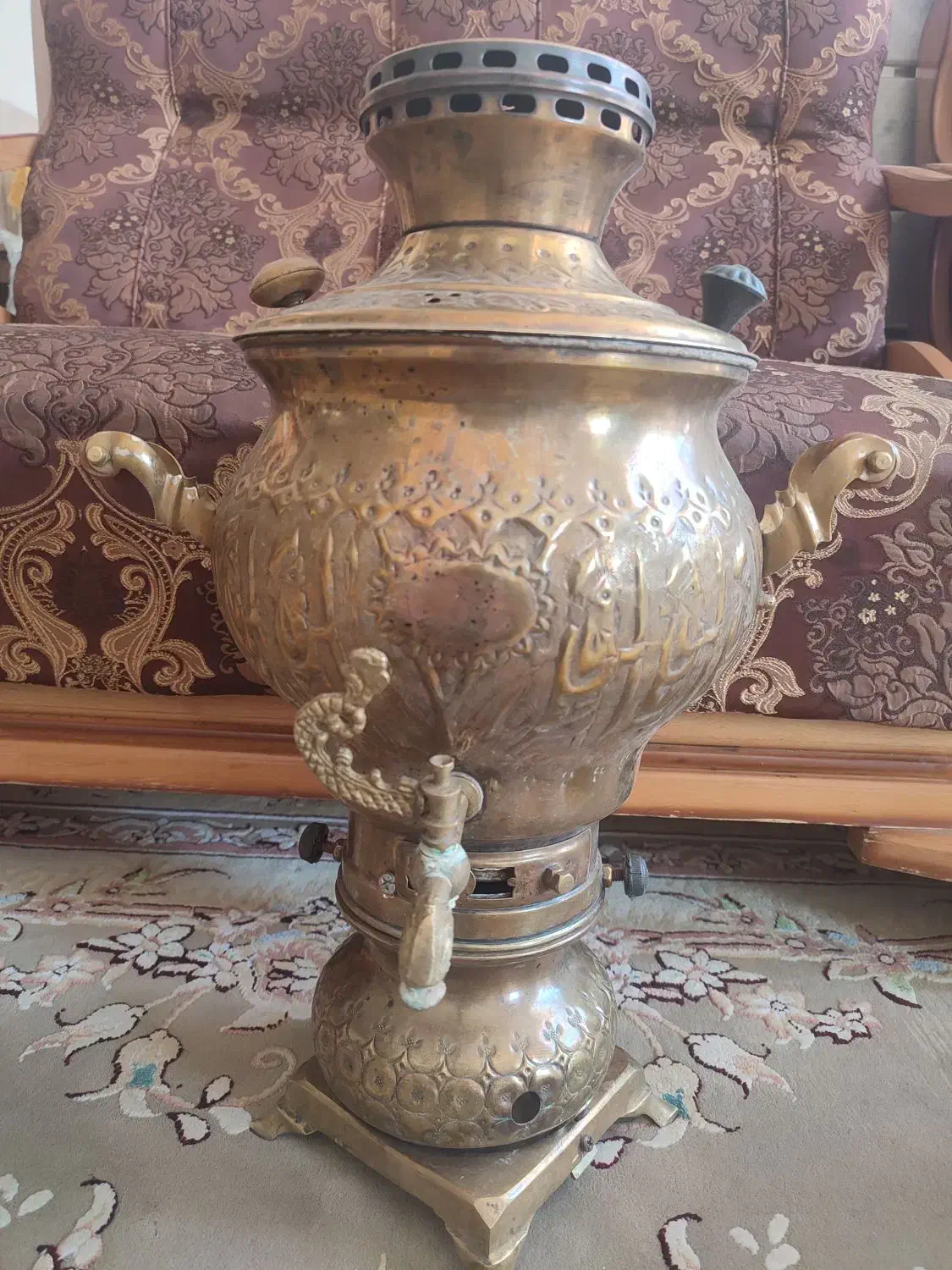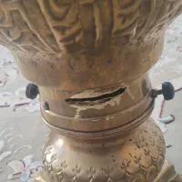 سماور برنجی ذغالی قدیمی، مربوط به چند سال پیش (کار دست و قدیمی). بدنه کاملاً سالمه، قطعات کامل (شیر، درپوش، دستگیرهها). اصل برنج، قلمکاری زیبا، سنگین و محکم. اول ساده بوده، بعد تبدیل به ذغالی شده (جای پیچ و مخزن ذغال داره). مناسب برای استفاده، دکور منزل یا کلکسیونرها یا باغ جنس برنج خالص (طلایی ـ زرد) با جلای خاص. سالم و بدون شکستگی. با تخفیف جزئی