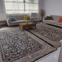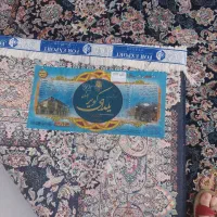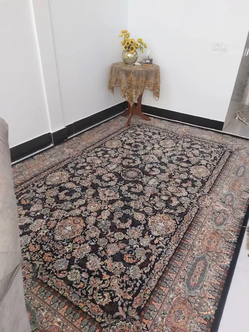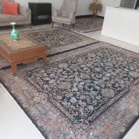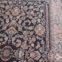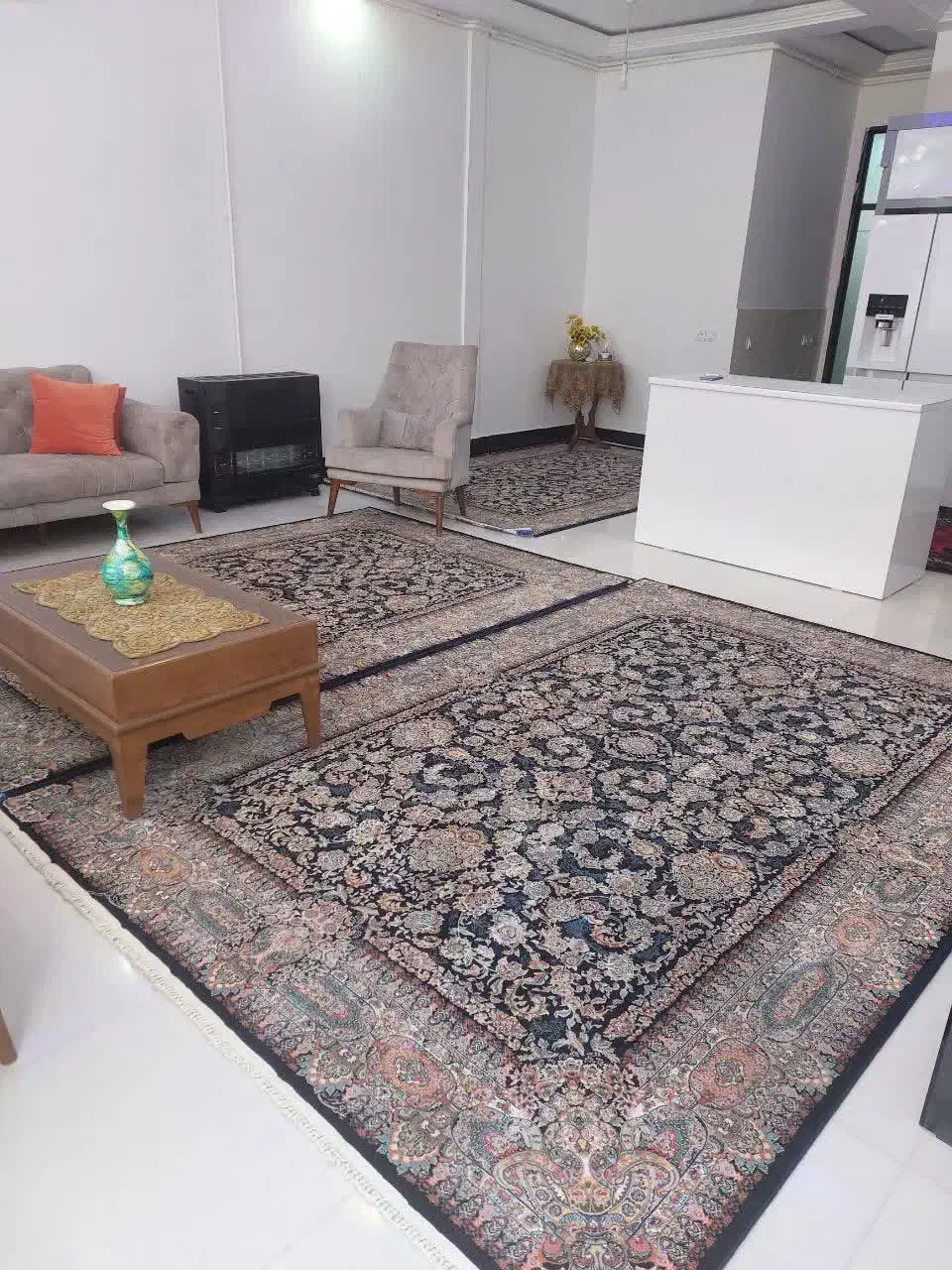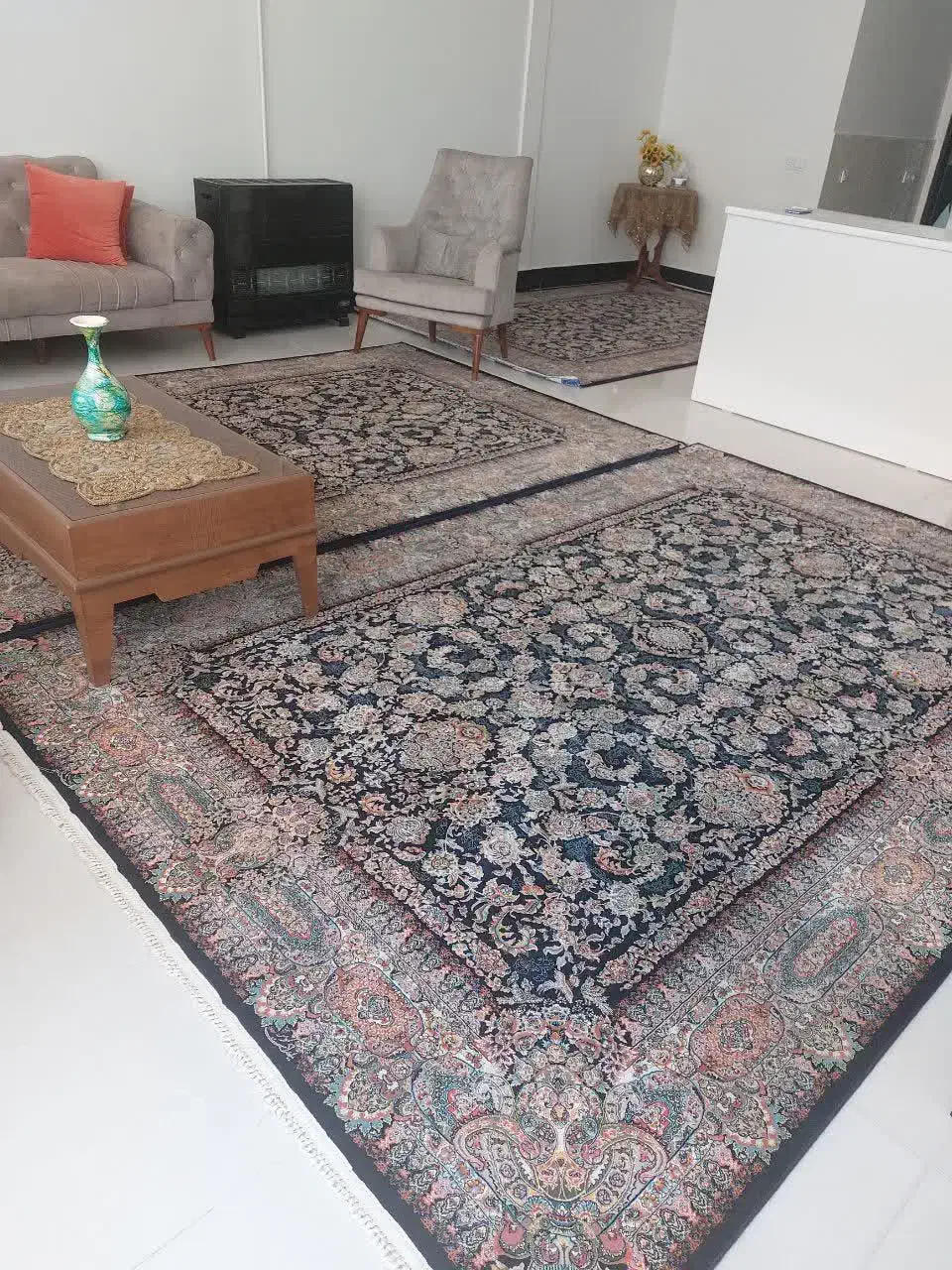 سنگین وزن پرز بلند ریزنقش و ریز بافت 1200شانه با تراکم واقعی3600 محصول یلدای کویر کاشان رنگ زمینه سرمه ای ابعاد ۶متری تعداد۳تخته قیمت هر تخته 10/500