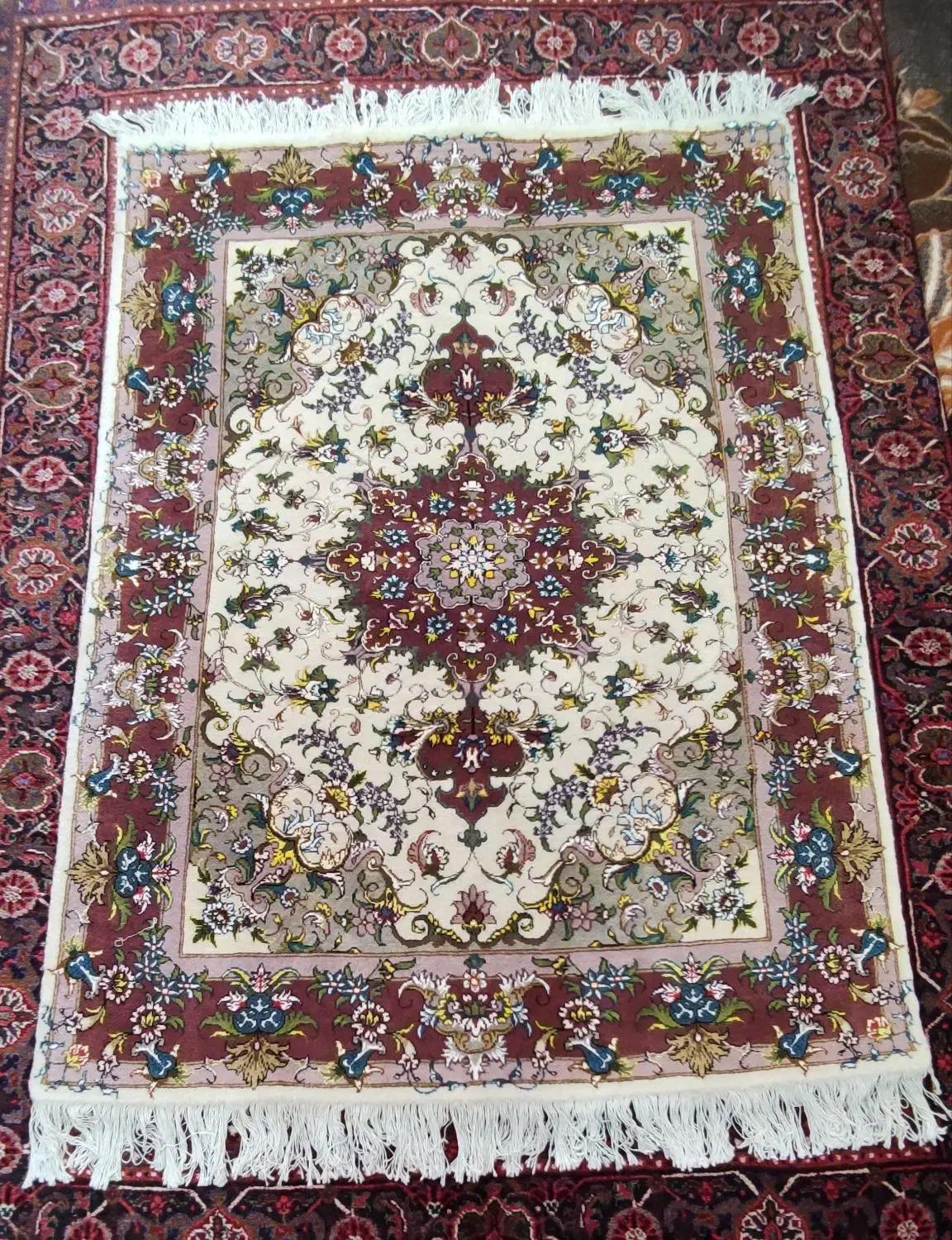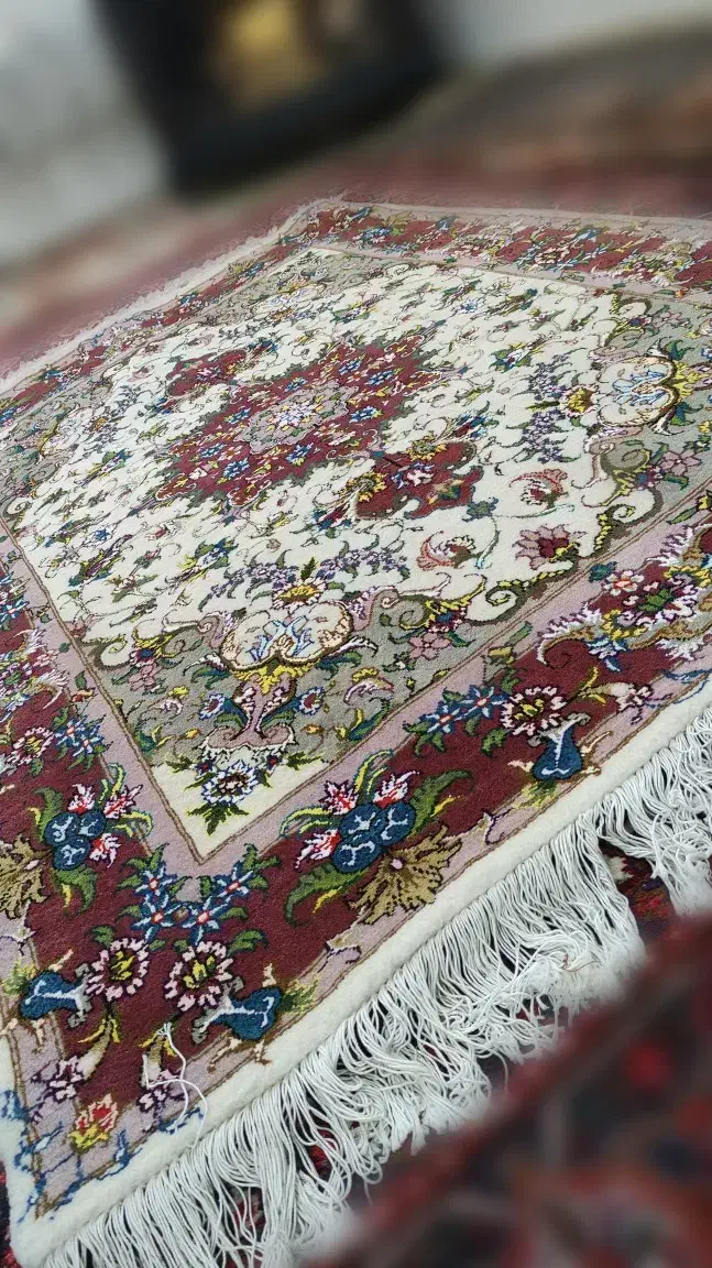 قالیچه به اندازه ۱.۵ در ۲ متر هست تازه تموم شده ، پرداختشو هم خودمون زدیم با پشم و ابریشم قاطی شده قیمت : ۲۰میلیون برای خریدار واقعی تخفیف جزئی هم داده میشه✨