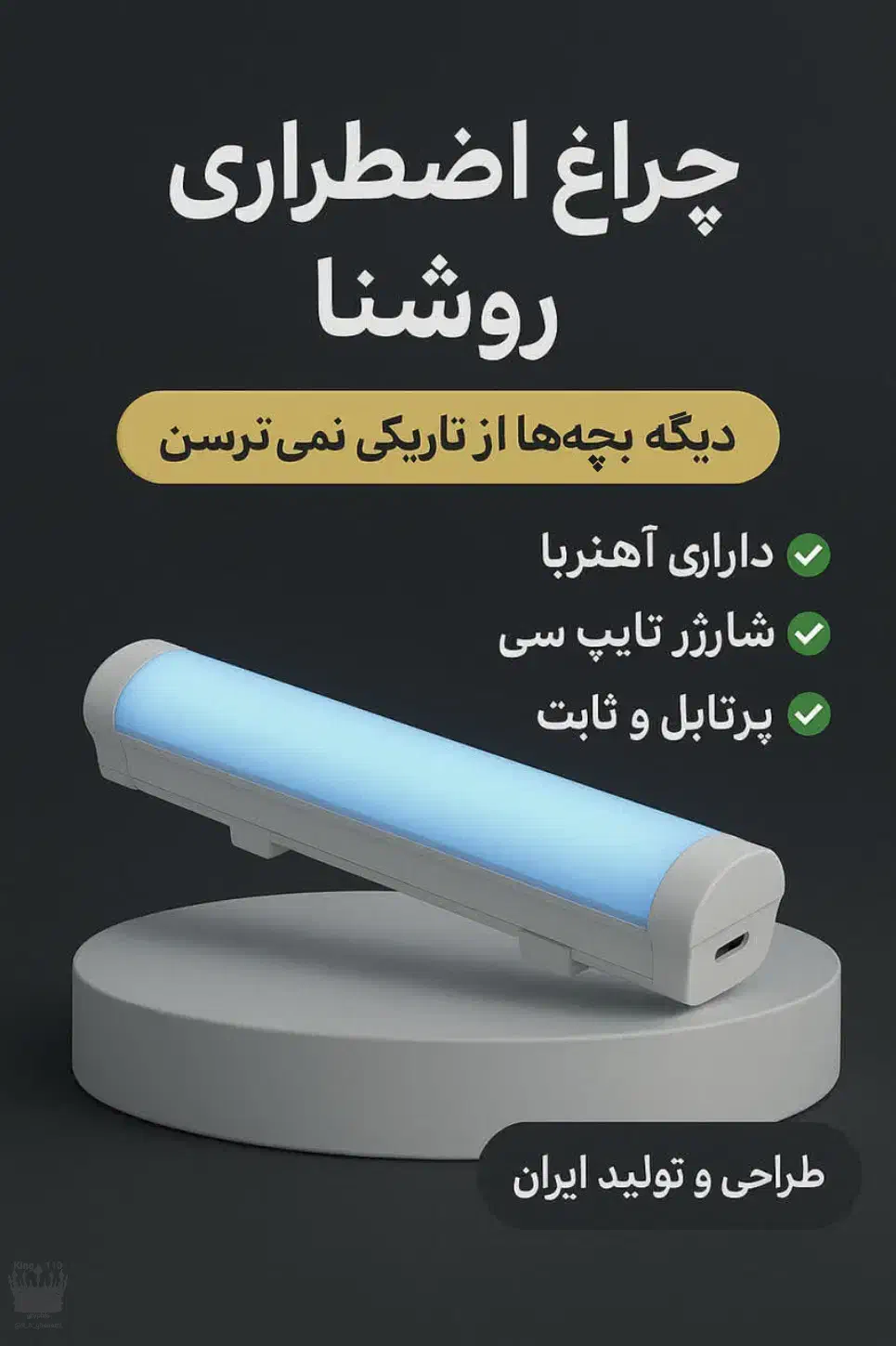 چراغ اضطراری، طول ۳۰ سانت هم می تونید ثابت به دیوار استفاده کنید هم می تونید پرتابل استفاده کنید با شارژر تایپ سی شارژ میشه اهنربا داره که به چارچوب در، کابینت،یخچال، بدنه ماشین میچسبه و می تونی از نورشاستفاده کنی. ۲ ساعت شارژ کامل داره ولی تا ۴_۵ ساعت نور داره. طراحی و تولید ملی هست. با افتخار ساخت ایران