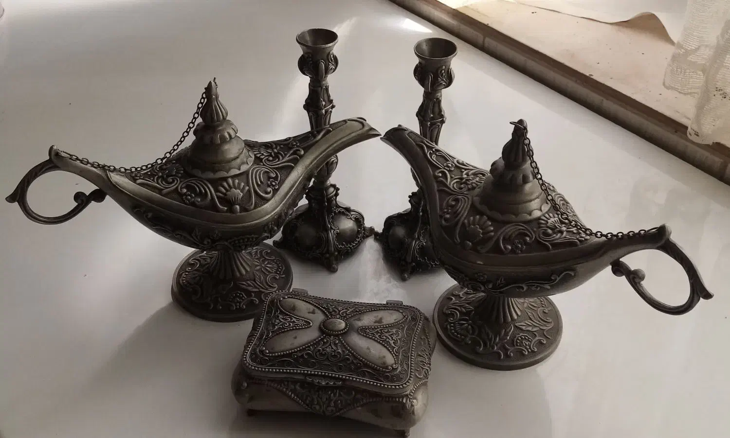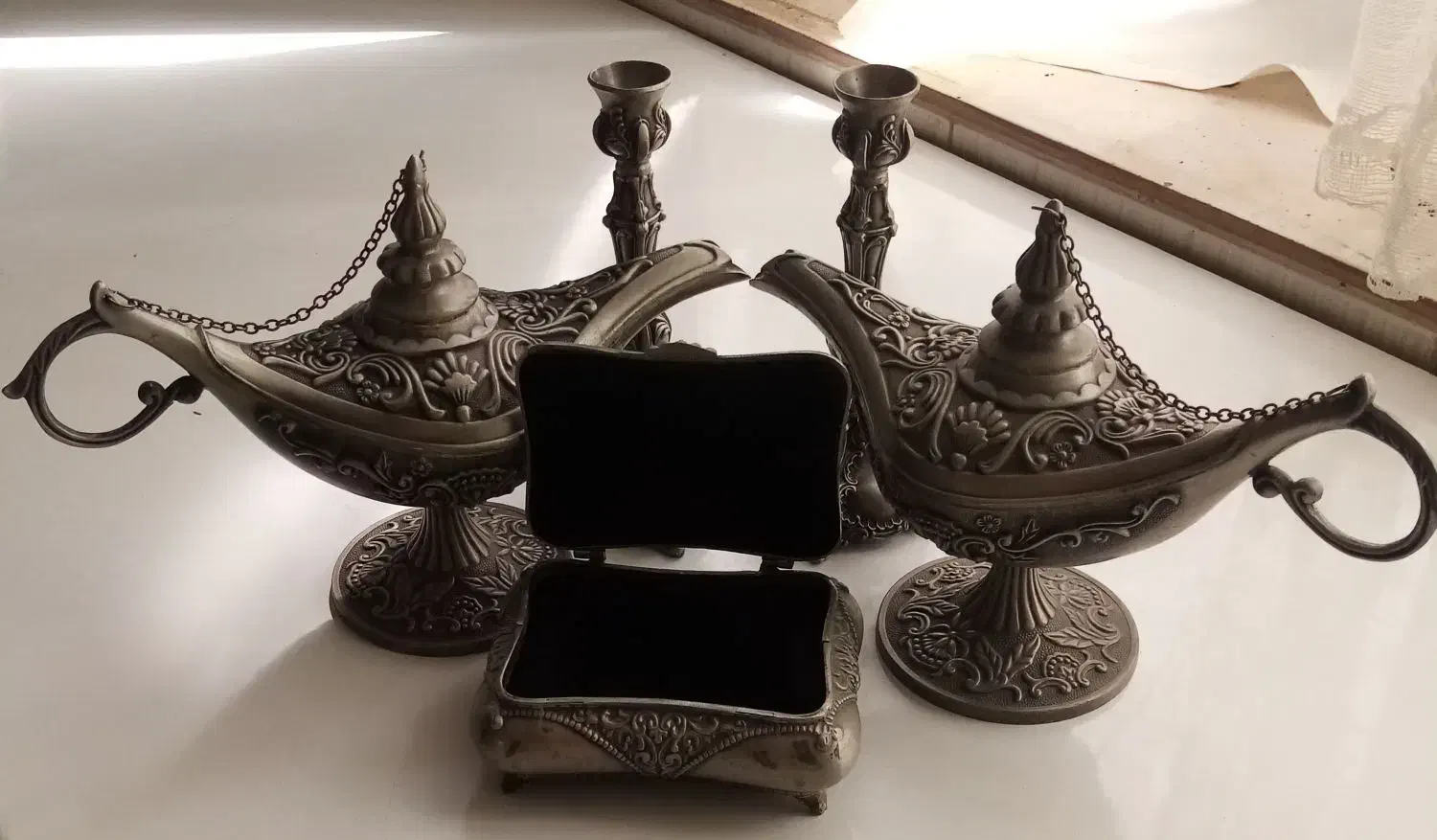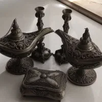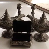 دکوری آنتیک و نفیس یک جفت چراغ جادو یک جفت شمعدان یکعدد جعبه جواهرات