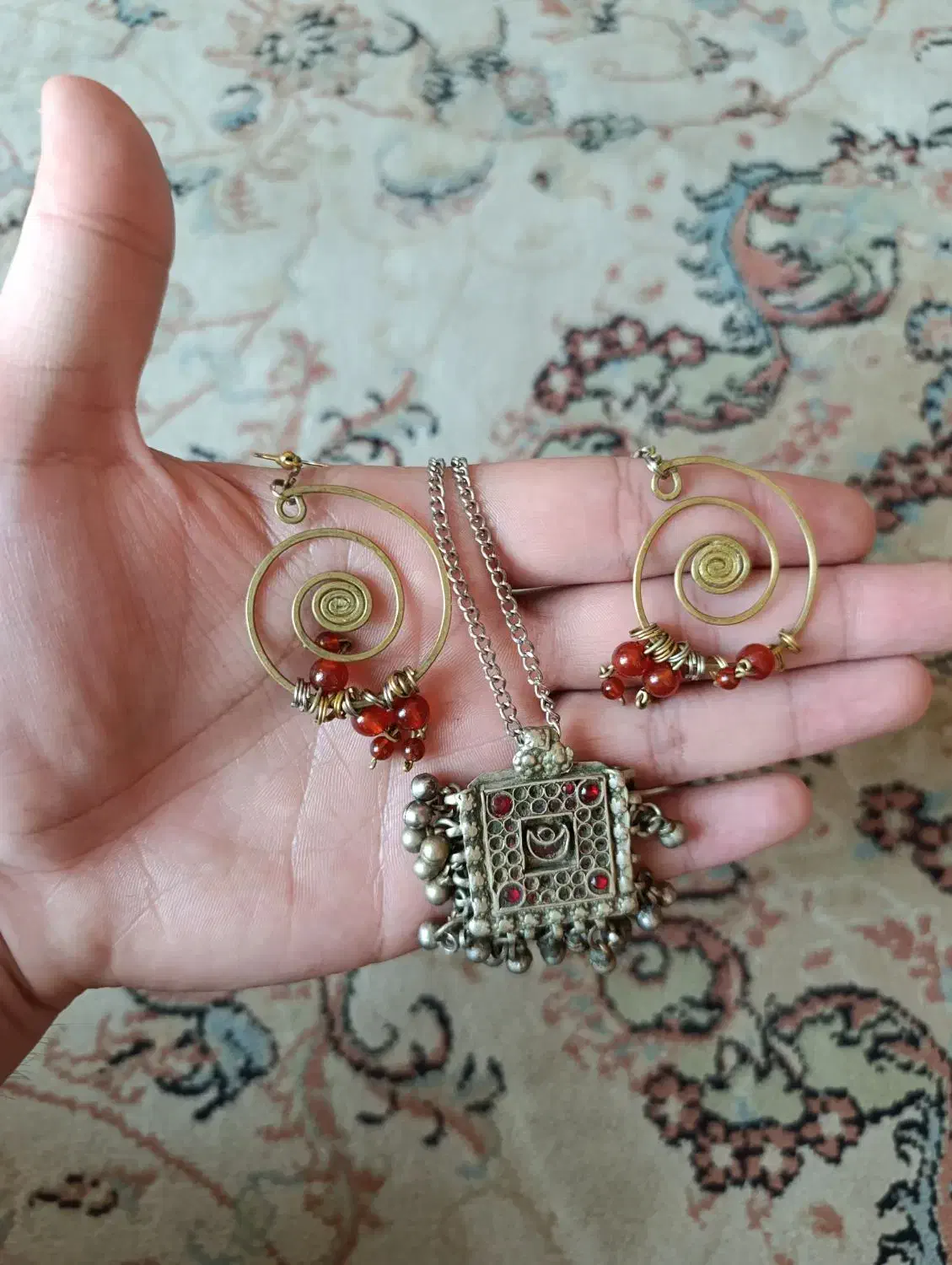 گردنبند طرح دار زنانه قیمت 1 میلیون تومان گوشواره حلزونی زنانه قیمت 1 میلیون و 500 هزار تومان آویز ساعت زنانه قیمت 500 هزار تومان